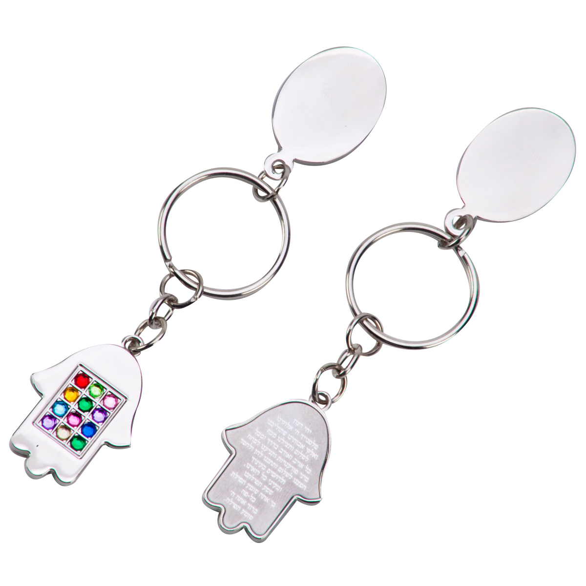 מחזיק מפתחות בצורת חמסה עם אבני חושן תפילת הדרך בחלק האחורי, לוחית מתכת להדפסה או חריטה.